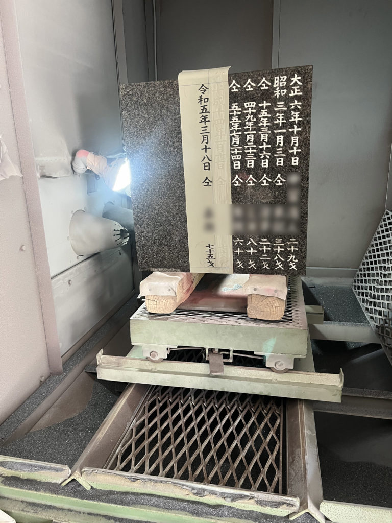 記名塔は一旦当社工場へ持ち帰り、専門の職人が丁寧に文字を彫刻します。彫刻後は再び現地に据え付けるのが一般的な流れです。